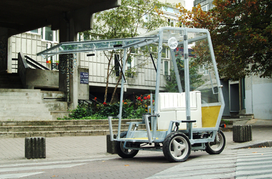 The Para Site is a vehicle that is entirely dependent, in that it relies on negociation in order to move: firstly an extension cord can be plugged into an electricity source (for example shops or neighbours), or secondly it can be pulled along by another car using a suction disc.