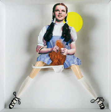 "The most reddish pubis ever seen", 2007 paper, puppet legs, shoe box, hair, fabric, acrylic box 27 x 27 cm