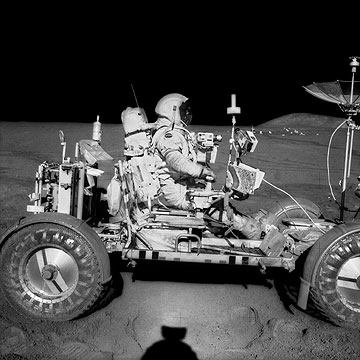 from: FULL MOON, 1999 "David Scott Drives the First Lunar Rover; Note Aerial Navigation Photographs; Photographed by James Irwin, Apollo 15, July 26-August 7, 1971" Digital c-print, Ed. 50, 62 x 62 cm