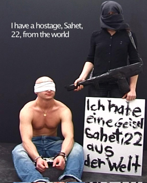 "Empower me!", 2007 Video 40 min + Installation, Maße variabel, Video-Rückprojektion im Hochformat, Banner (Karton, Farbe), Kopfhörer, Aschenbecher
